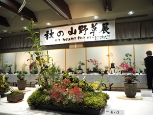 精魂込めて育て上げた秋の山野草が並びます。育て方などの質問があれば、会場にいる愛好会のみなさんに気軽にお尋ねください。即売コーナーもあります!