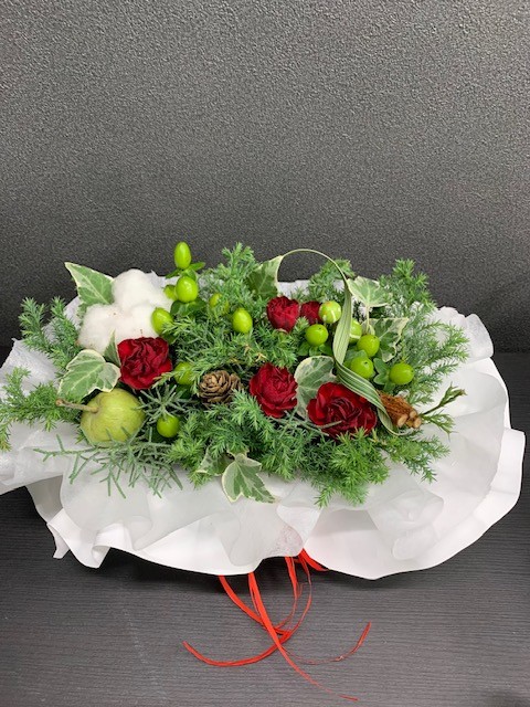 ◎お見本写真は、スプレーカーネーション(赤)、ヒムロスギ (緑細かい葉)、ブルーアイス (白っぽい緑色のコニファー) 、ピペリカム(きみどりの実)、マツカサ、青りんご(観賞用)、コットンツリー(白の綿花)、アイビー (斑入りつるの葉)を使用。