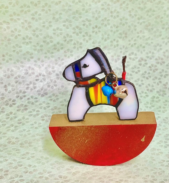 | コメント | ステンドグラスで可愛いチャグチャグ馬っこをつくります。色ガラスのパーツに銅のテープを巻いて、はんだ付けをします。来年の干支、午の置物をお部屋に飾りましょう♪