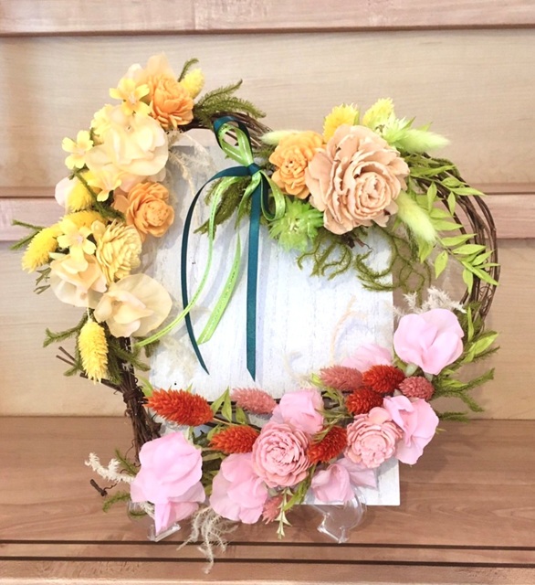 | コメント | 自然素材のドライフラワーやソーラフラワー、造花のアートフラワーなどを使って可愛いハート型のリースをつくります。花材を専用スポンジへ挿してアレンジします。
