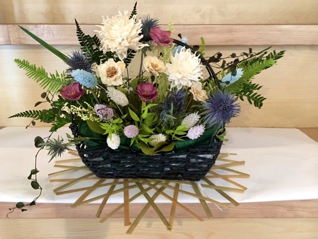 | コメント | 初夏にさわやかな色合いの自然素材(プリザーブドフラワーやドライフラワーなど)を使用した作品です。黒い籠にスポンジの土台を入れ、花材を挿してアレンジします。お部屋を華やかに彩りましょう♪